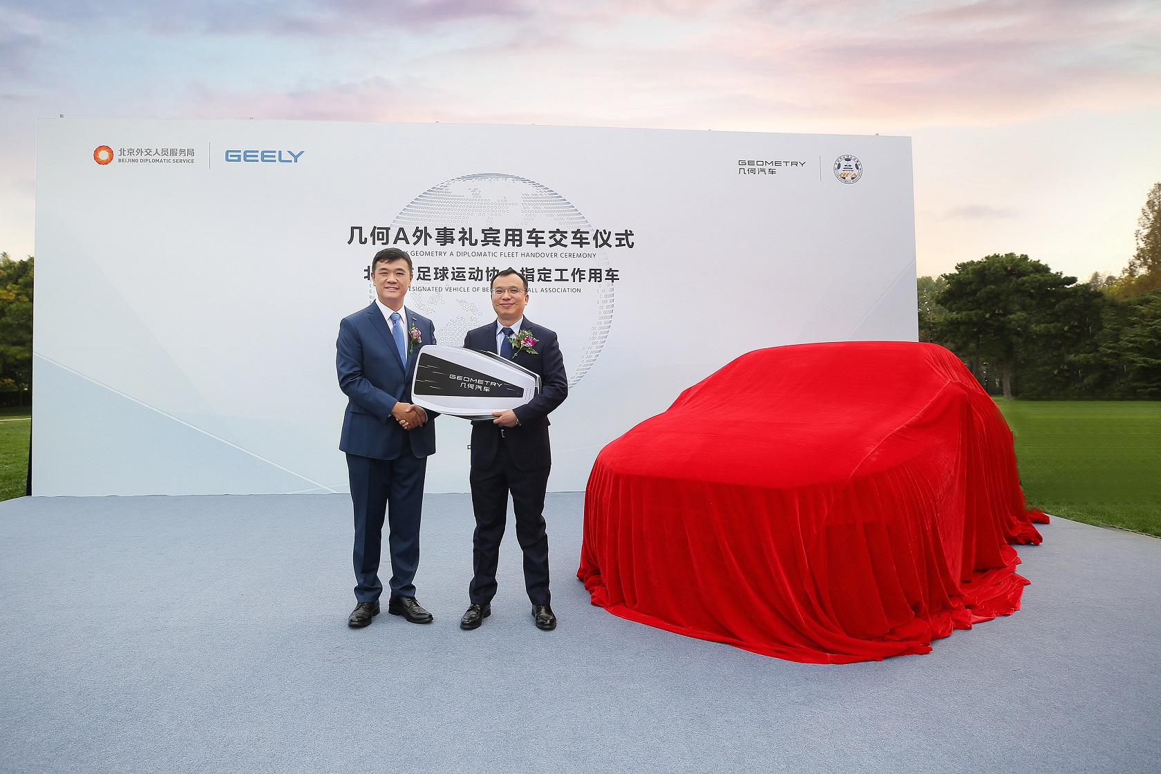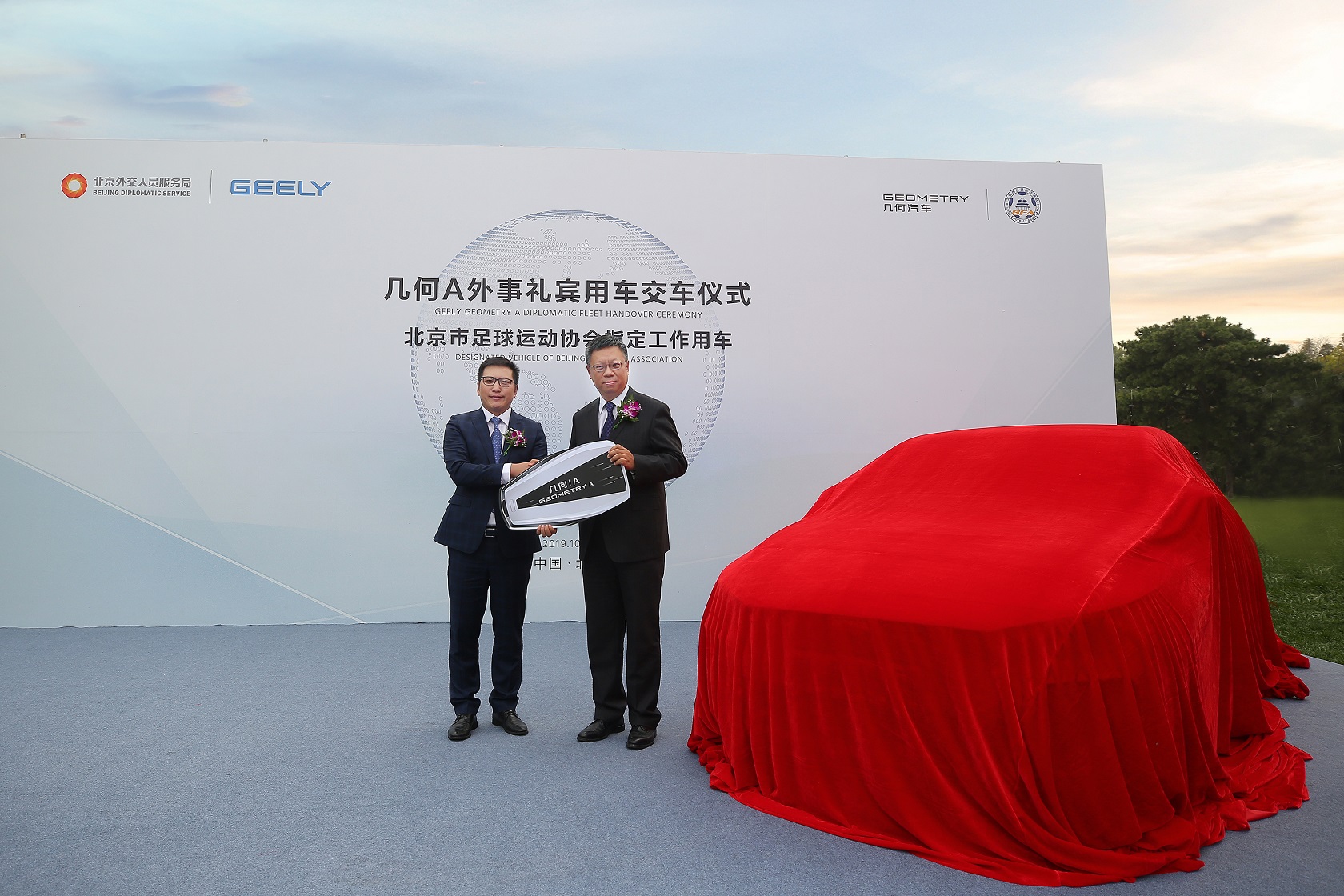 10月22日, 几何A外事礼宾用车和北京市足协工作用车交车仪式在北京行。北京外交人员服务局副局长陈闯,北京市足协主席、北京市体育局副局长杨海滨,金年会汽车集团副总裁、销售公司总经理林杰,几何品牌销售公司总经理郑状等作为双方代表完成了交付仪式。“国足福将”于大宝作为几何A的新晋车主出席了活动。此外,摩洛哥、萨尔瓦多等国家的驻华使节也亲临交付现场,共同见证了这一属于中国汽车品牌的荣耀时刻。