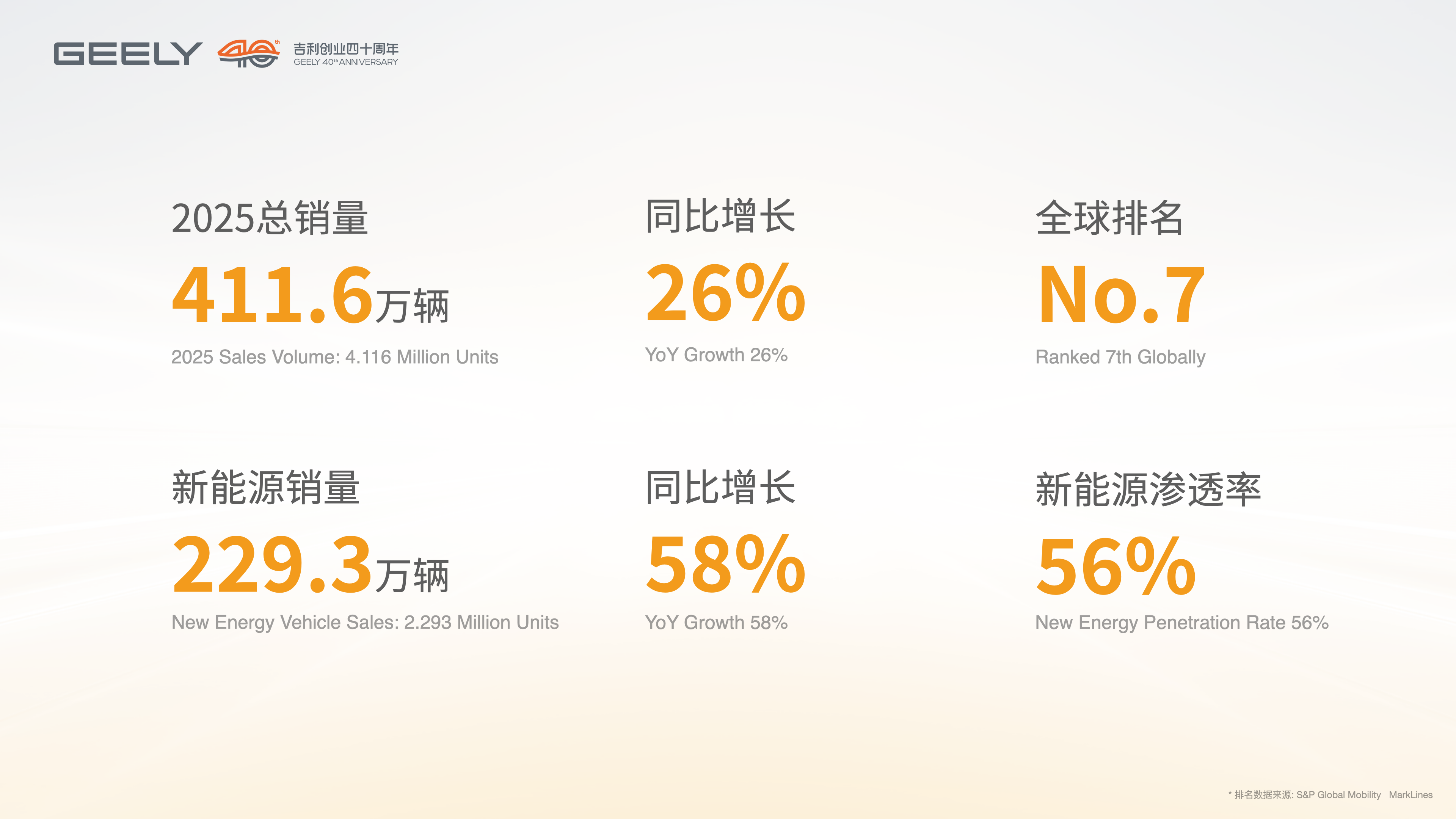 In 2025, Geely Holding focused on its core businesses, demonstrated strong resilience and stable development: total sales reached 4.116 million vehicles, a year-on-year increase of 26%, and achieved five consecutive years growth. Sales of new energy vehicles reached 2.293 million vehicles, a year-on-year increase of 58%, with a new energy vehicle penetration rate of 56%. Geely Holding’s sales exceeded 4 million vehicles for the first time, ranking seventh globally and becoming the fastest-growing company among the top ten global automotive groups.