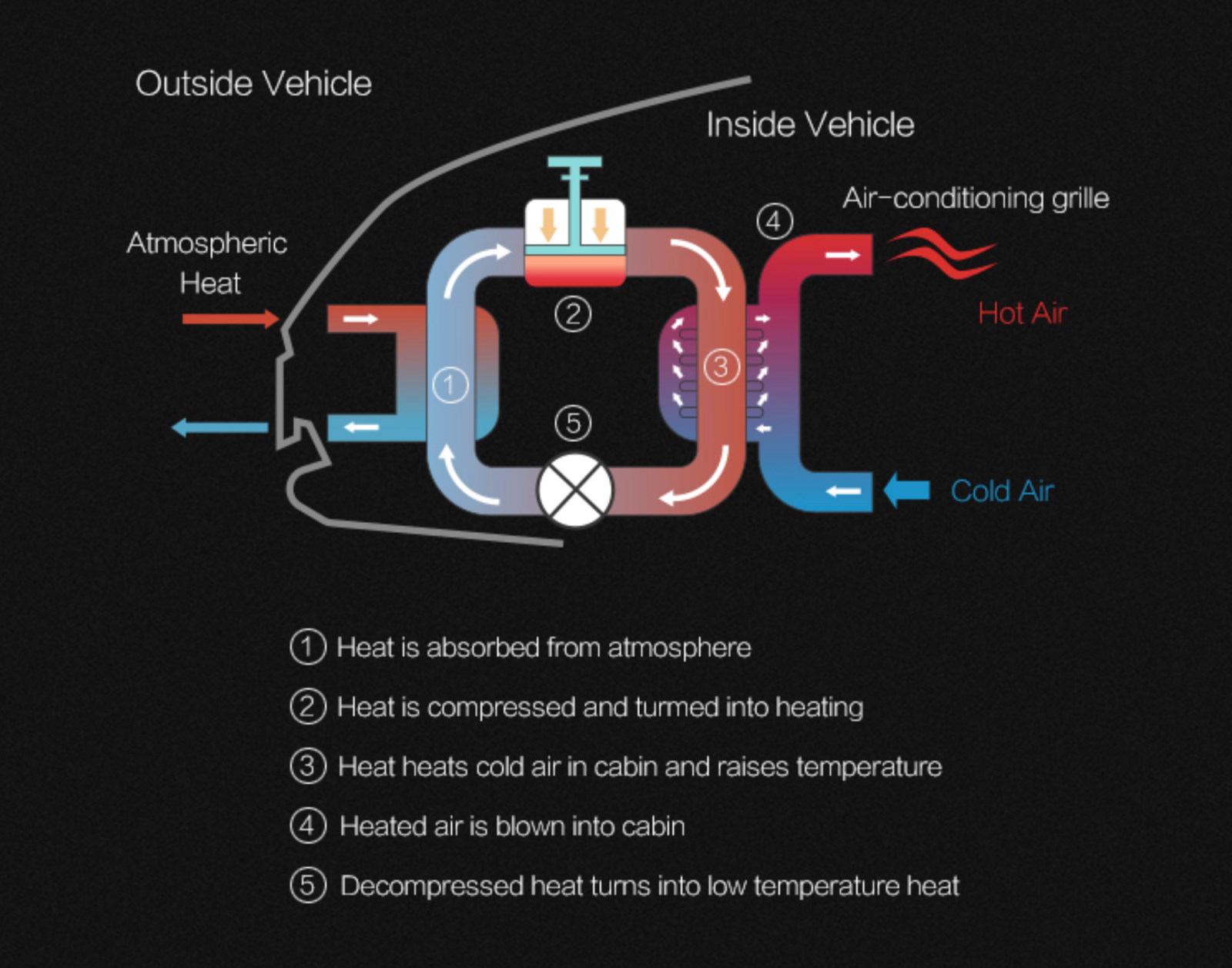 The strength of a heat pump comes from the way it moves heat. It can move heat from a low working temperature (i.e. the exterior of the car in cold weather) and pump it to a high working temperature in the battery compartment, while using minimal additional energy to heat the passenger compartment. During the process, electricity is only used for the redirection of heat from one part of the system to the next.
